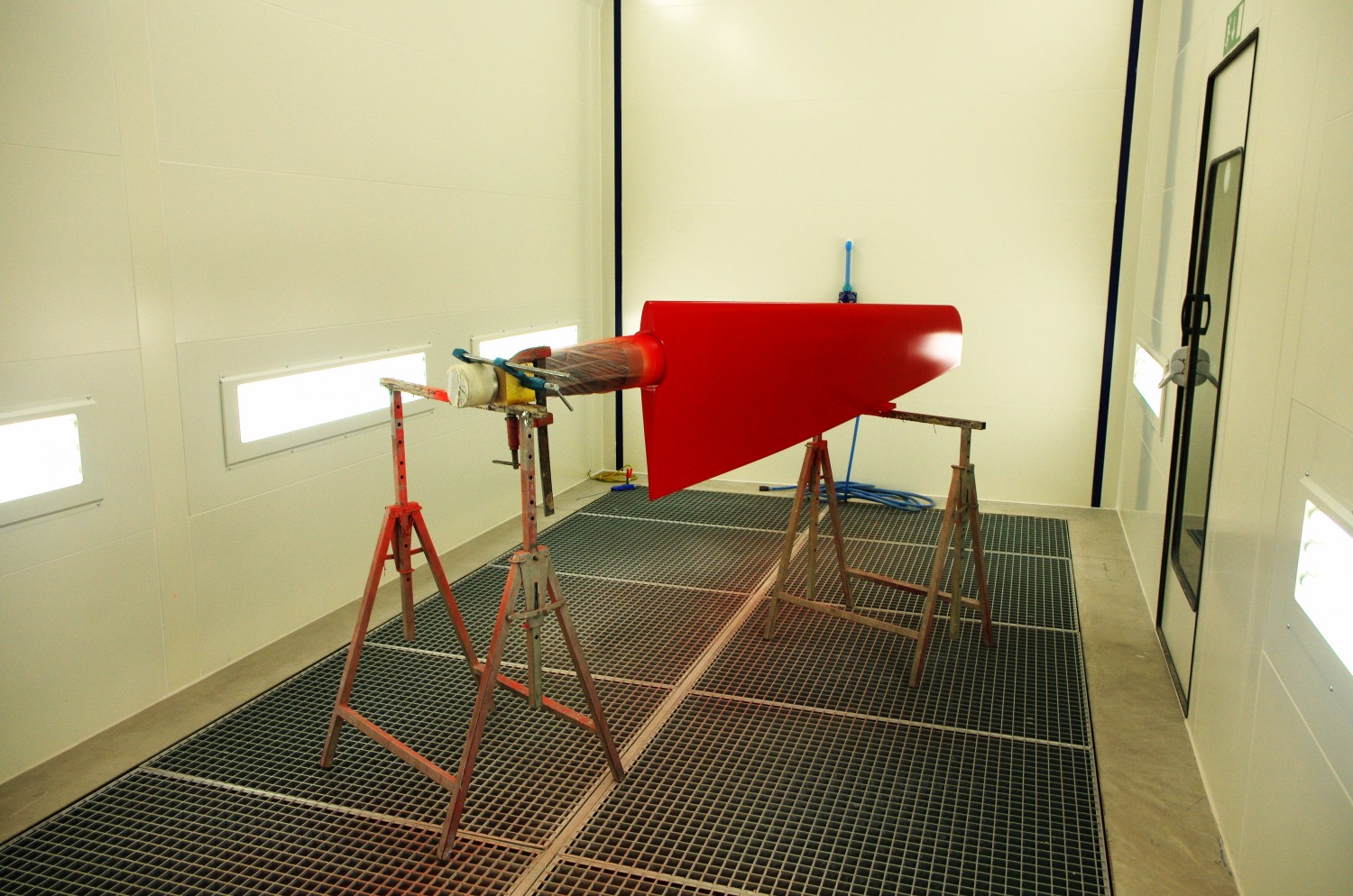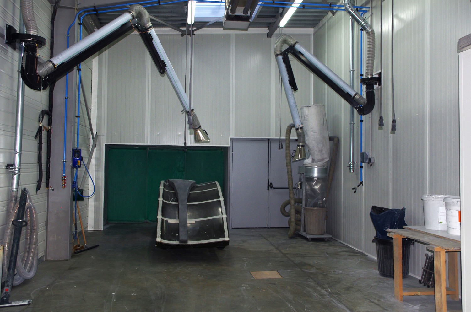 Une cabine de peinture de plus de 7m de long, une centrale d’aspiration pour les poussières, une hotte aspirante pour les vapeurs de solvant et une salle dédiée aux activités bruyantes et salissantes, sont les principaux outils qui ont été déployés.